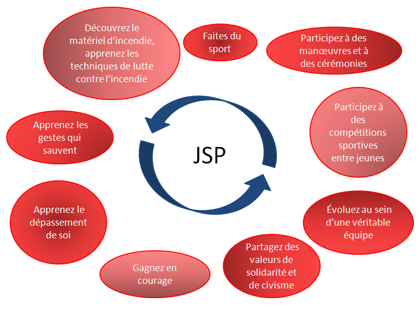 Le référentiel de formation des jeunes sapeurs-pompiers est calqué sur celui de l’équipier de sapeur-pompier volontaire. Cette particularité évite aux JSP d’avoir à repasser l’ensemble des modules au moment de leur recrutement comme sapeurs-pompiers volontaires, mais uniquement ceux qui leur manquent